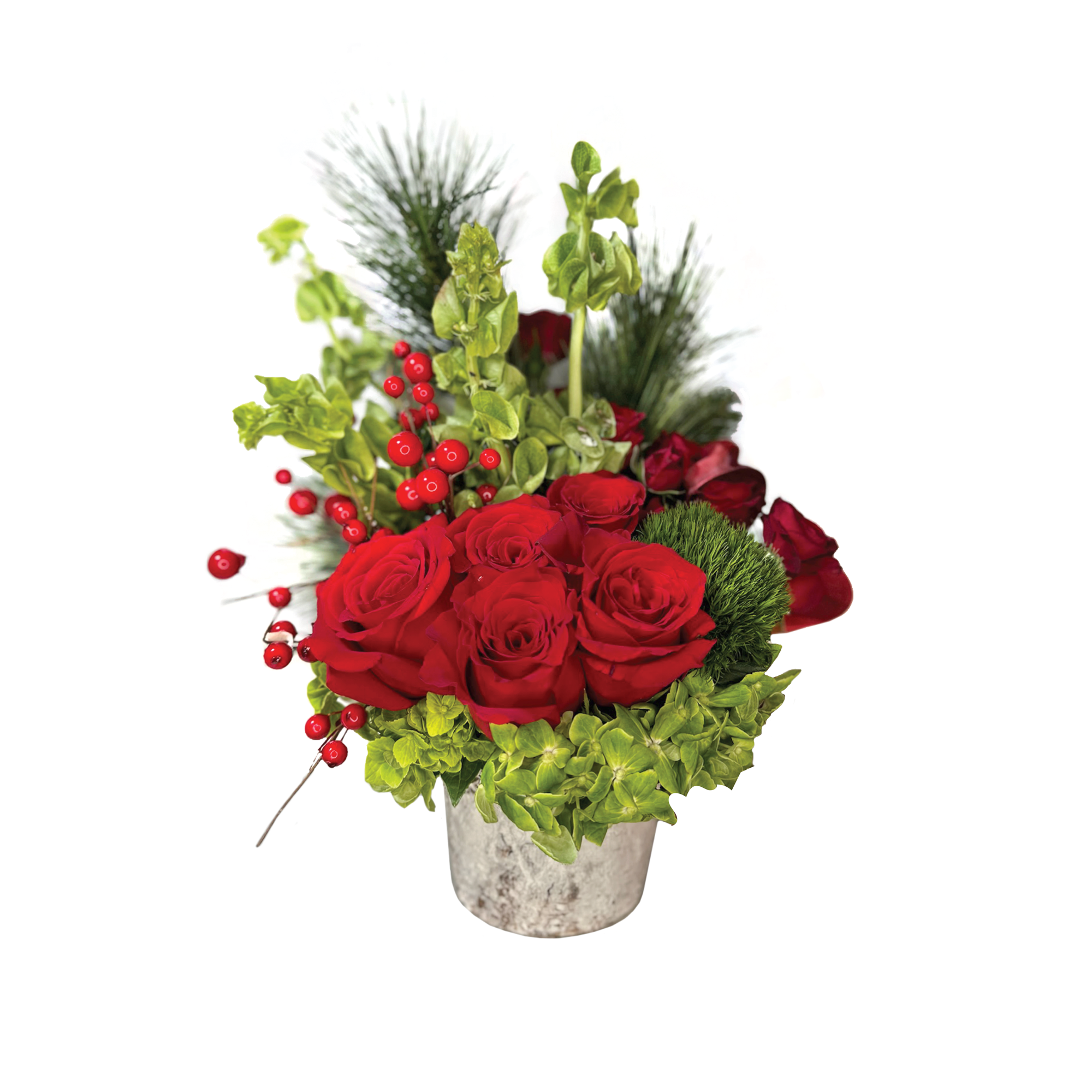 Get into the holiday spirit with the Deck the Halls arrangement. With vibrant red roses, hydrangea, pine and festive berries, this arrangement is perfect for spreading holiday cheer!